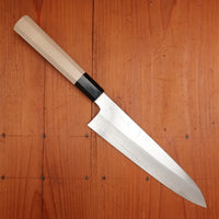Hand forged in Sakai and ground by a young sharpener in Sakai. These knives come with an impressive lineage with the sharpener's grandfather being one of a few knife makers who pioneered the wide bevel grinding on double bevel knives.