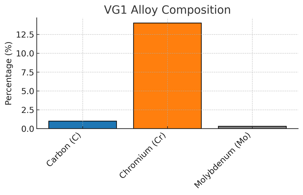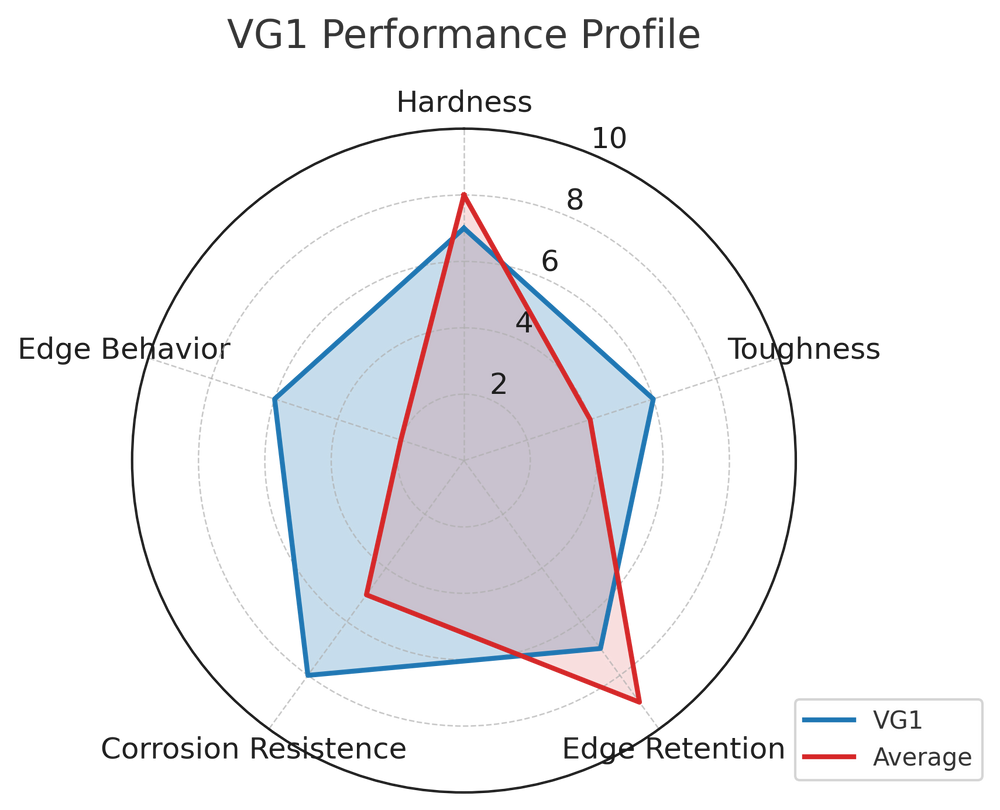 VG1 is similar to VG10 in carbon and chromium content (around 1% and 15% each respectively) but lacks the vanadium and cobalt of VG10 which makes VG1 easier to sharpen but with slightly less edge life. It is an excellent quality stainless that has a good balance of characteristics, great for those who want to maintain an edge easily that requires low maintenance. These are hardened to 61/62, and care must be taken to avoid chips from mistreatment.