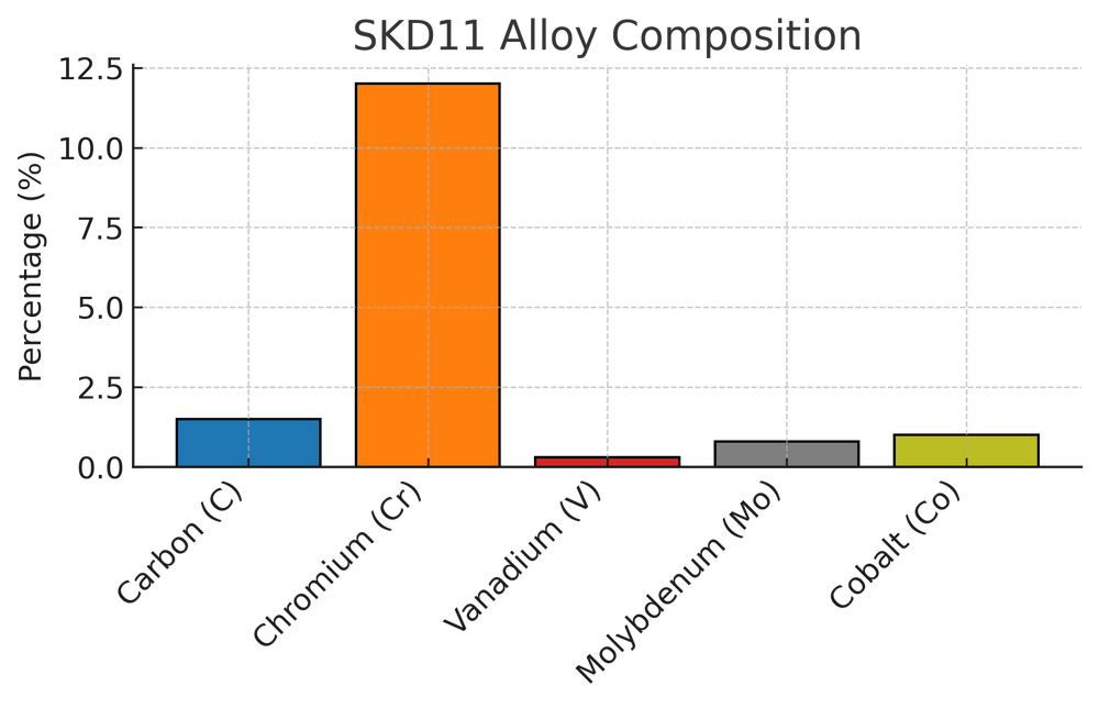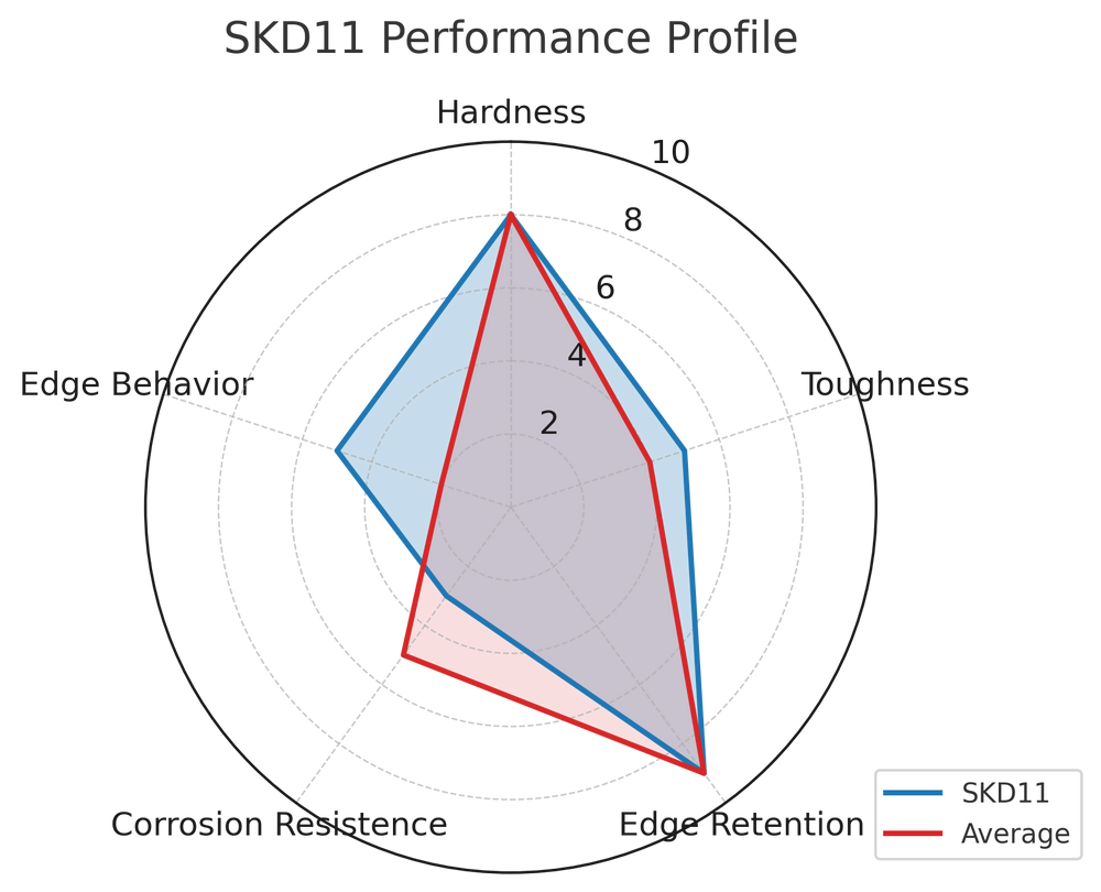 SKD steel is a nearly stainless carbon steel at approx 11-12% chromium content (13% and the chromium is able to bond with itself forming a stain resistant film) it is sometimes referred to as 'semi stainless' as it rusts slowly and has low reactivity with flavors.