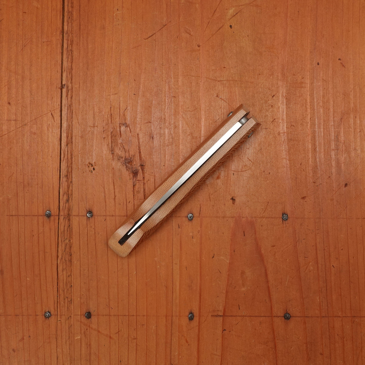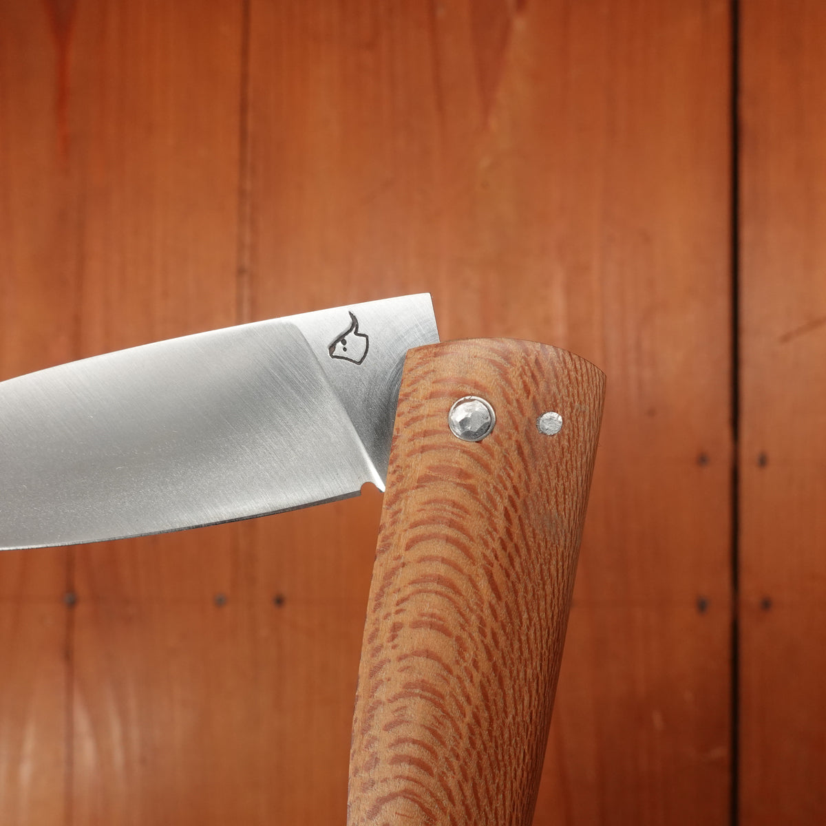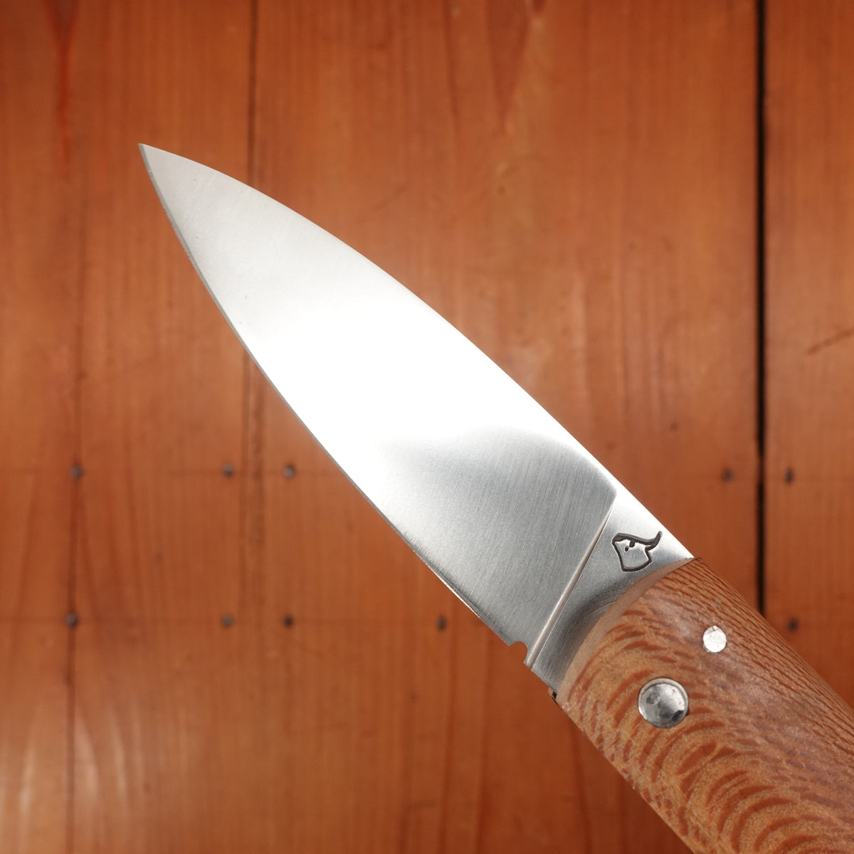 These French friction folders are known as Capuchin in France for the resemblance if held upside down of the pommel to a monks hood. They are a very old style of construction with a pin behind the tang to stop the blade as it opens, but no lock, this design goes back hundreds of years and was popular among farmers and working people as a reliable inexpensive knife. David's take on them are simple and elegant, they feel comfortable in the hand and will age nicely with use.