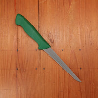 6" stainless steel straight stiff boning knife with green plastic ergonomic handle from the Pikas-Don Carlos line.