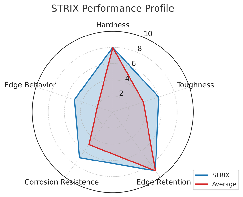 SPG STRIX is a brand new specialty powdered steel. It is produced by Takefu Special Steel Company. The high hardness, along with substantially finer grain structure and carbides, set STRIX apart from more conventional powdered steels on the market. This paired with advanced forging and heat treating allows for outstanding edge retention without having to sacrifice ease of sharpenability.