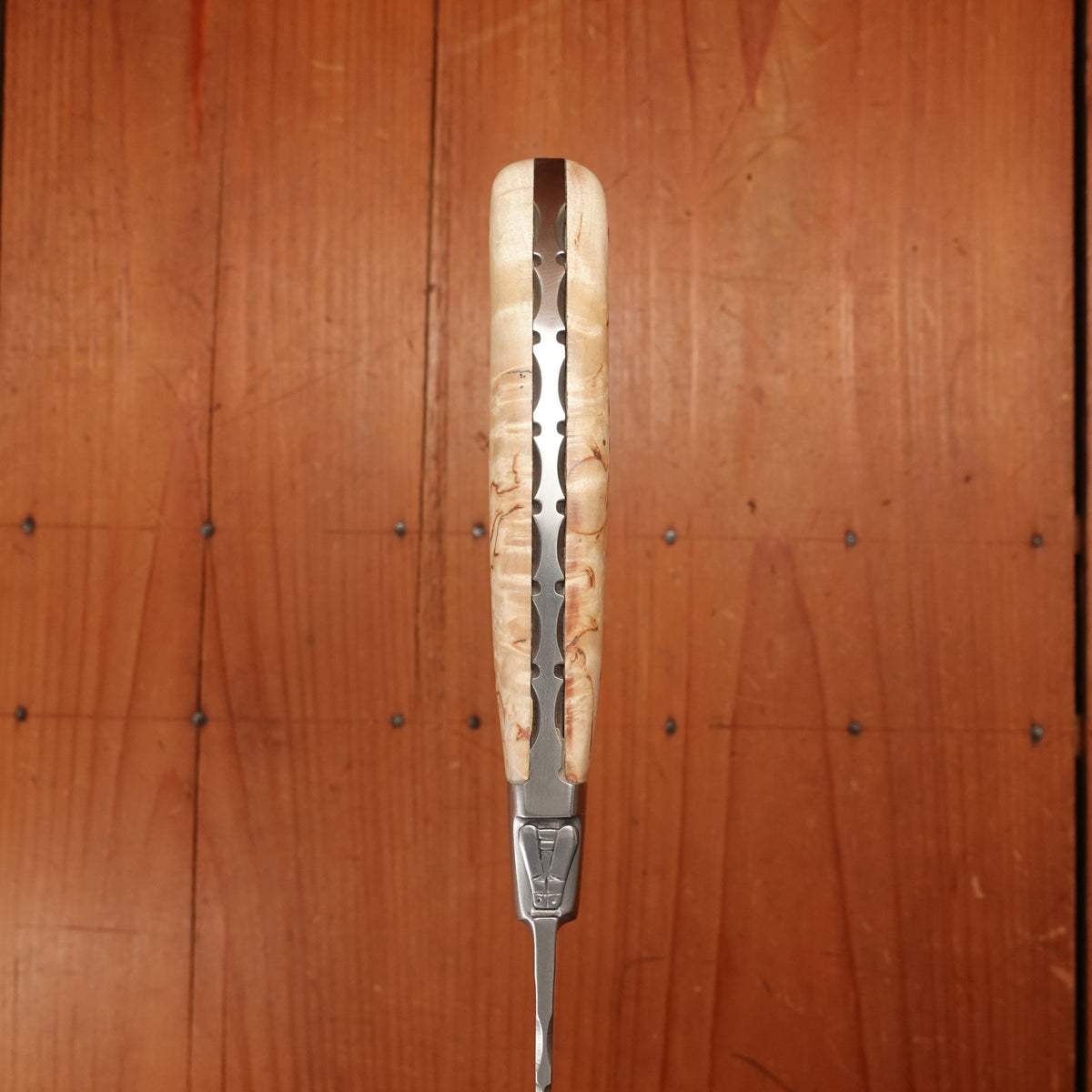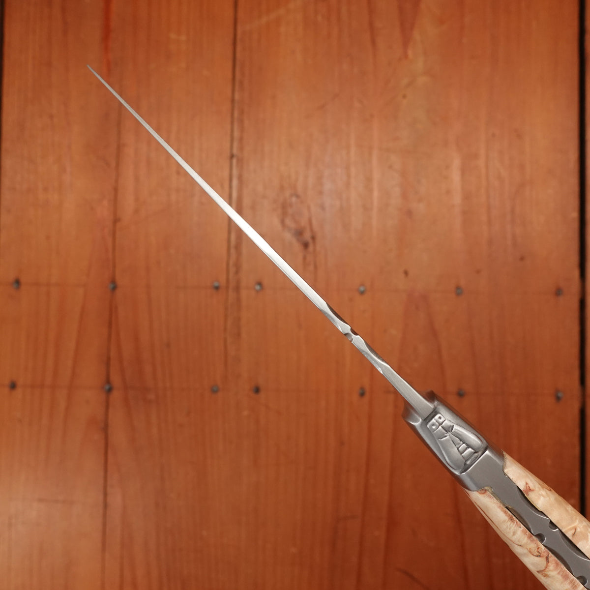 The Laguiole knife has a distinctive design influenced by the Spanish Navaja. A smaller, more tactile version was made for the sheep-herders on the Aubrac plateau in France, and was named after the town Laguiole. In addition to the iconic ‘bee’ or ‘fly’ on the spring, typically they feature a semi yataghan shaped blade, a slip joint mechanism with a slim tapered handle made from natural material, traditionally cow horn.