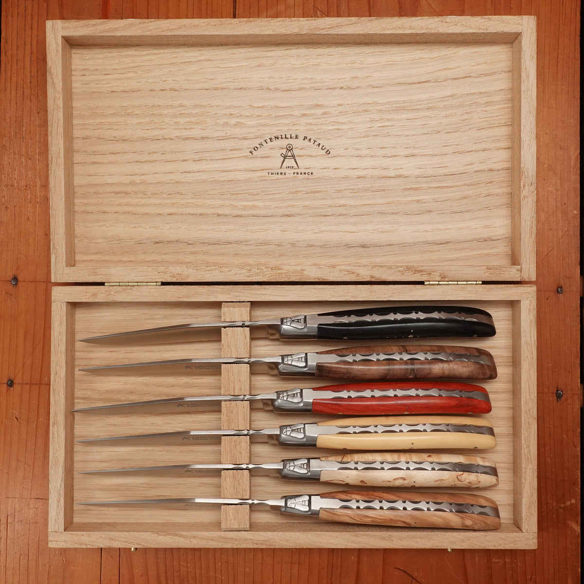 Fontenille Pataud Laguiole Steak Knife Set Stainless Mixed Wood Handles - 6 Pieces