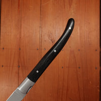 The Laguiole knife has a distinctive design influenced by the Spanish Navaja. A smaller, more tactile version was made for the sheep-herders on the Aubrac plateau in France, and was named after the town Laguiole. In addition to the iconic ‘bee’ or ‘fly’ on the spring, typically they feature a semi yataghan shaped blade, a slip joint mechanism with a slim tapered handle made from natural material, traditionally cow horn.