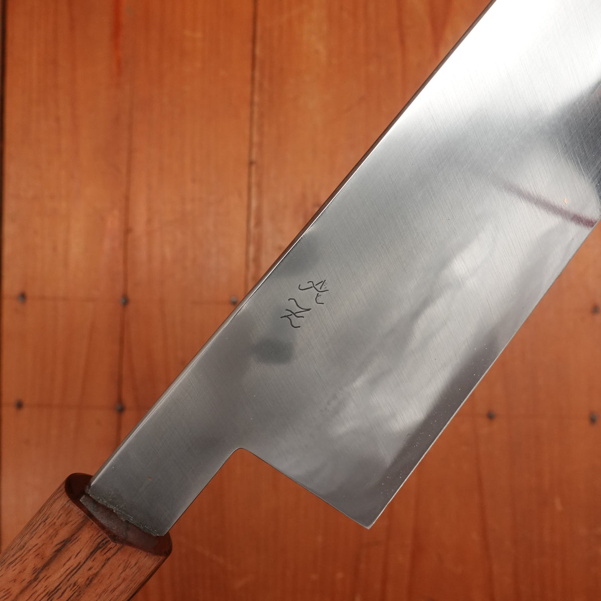 AZ honyaki knives are forged from Uddeholm UHB20C—a clean, high-carbon Swedish steel with properties similar to White #2. The steel is differentially hardened using the abura yaki-ire technique, where a clay coating creates a harder edge and softer spine when quenched in oil. The process demands close control over variables like clay application, quench time, and blade geometry. The result is a durable, high-performance blade with a visible hamon and a hardness of 62–63 HRC.