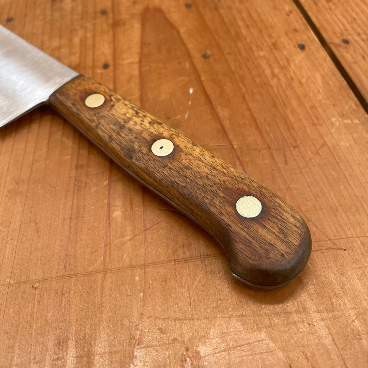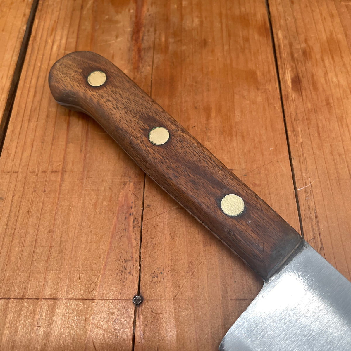 Vintage LF&C Universal (marks lost) chef knife made in the 1930's to 60's with carbon steel and light hardwood handle. Thin and light, this wasn't the most expensive line in it's day but still a good quality light knife.