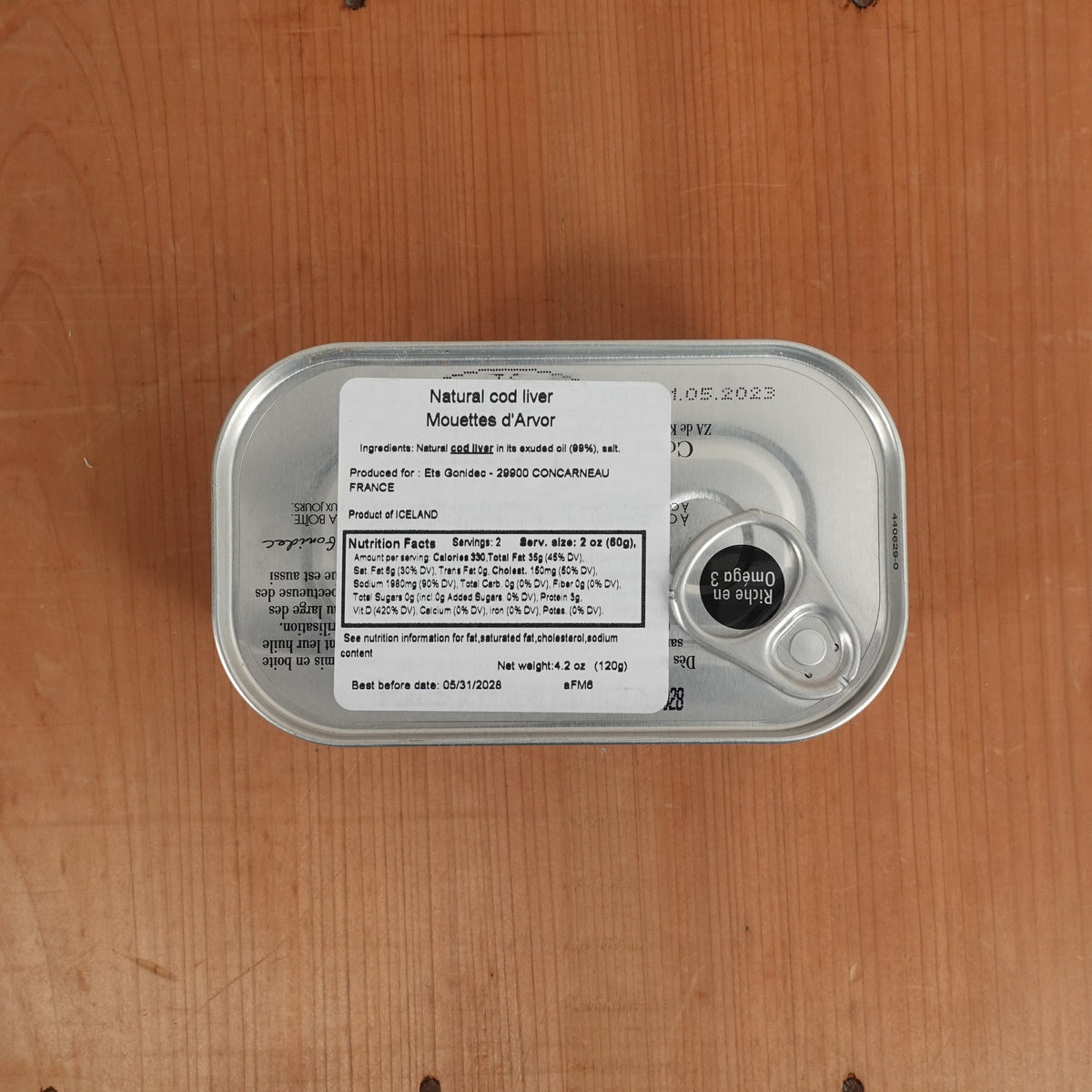 Sometimes simple is best. The ingredients of this tin are: cod liver and a pinch of salt. All of the oil in the tin is cod liver which has naturally expressed from the liver during the canning process.