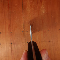 This knife had been sharpened in enough to make for a somewhat thick edge but not so much as to dramatically change its profile and height. It has been re-ground and thinned to bring it back to its original geometry, the 'ebonized' (iron and gall tannin dye) fruit wood handles are solid and secure with no gaps, there are a few small cracks.